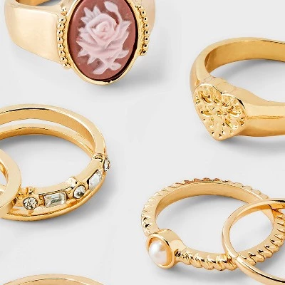 Eight-piece ring set from Wild Fableā¢. Features varying designs that range from a simple band to a heart, flower and more. Gold-tone metal rings complement a range of outfits. Spot or wipe clean for easy maintenance.
