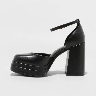 Faux-leather pumps from Wild Fable⢠set on a four-inch platform heel with a textured outsole. Designed with a round closed-toe vamp and covered heel with a wrap-around buckle strap. Memory foam insoles provide all-day comfort.