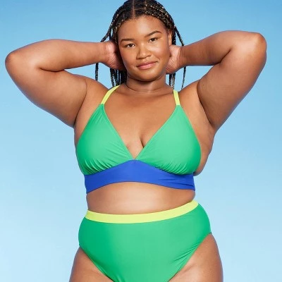 Triangle bikini top from Wild Fable™ with a colorblock pattern in green and blue. Made from soft and stretchy fabric with full lining for comfortable wear in and out of the water. Removable cups provide customizable coverage for confident wear.