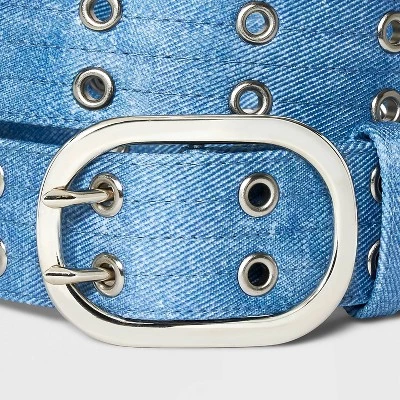 Denim blue belt from Wild Fable™ made of 100% recycled polyester. Designed with an oval-shaped double-pronged buckle in silver-tone and two rows of shiny grommets across the length. Features 36-inch length with double belt loops.