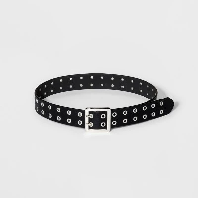 Black belt with silver grommets throughout. Made from faux-leather and has a shiny silver belt buckle. Double grommets let you adjust the fit. If you’re not satisfied with any Target Owned Brand item, return it within one year with a receipt for an exchange or a refund.