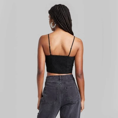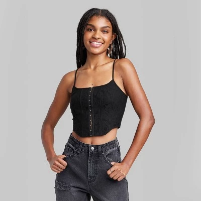 Lace corset tank top from Wild Fable™ in a solid hue. Tailored in a slim-fit silhouette with a front full-length hook-and-loop fastening and a smocked panel at the back. Features corset-inspired stitching accents and a scoop neckline with adjustable shoulder straps. Made from a lightweight cotton blend for comfortable all-day wear. Cropped length with a curved hem on the front completes the design.