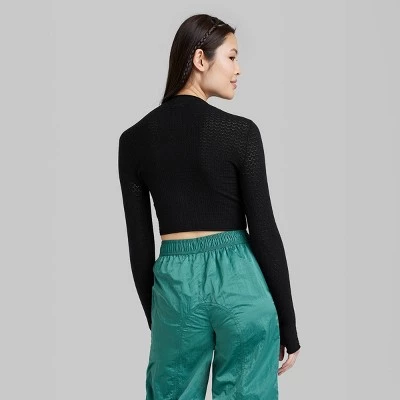 Long-sleeve pointelle sweater from Wild Fable™. Made from lightweight jersey fabric in a slim-fit silhouette. Designed in a solid hue with a mock turtleneck and pointelle construction. Features thumbholes for added warmth.