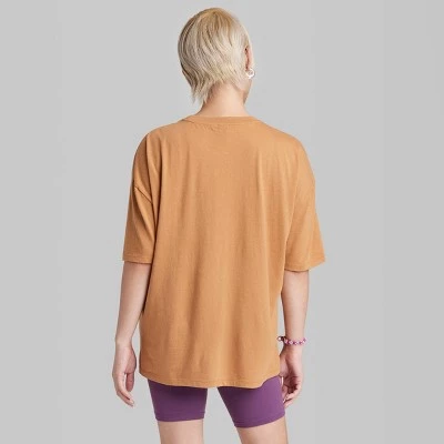 Oversized T-shirt from Wild Fable™ in light brown with a pink distressed-finish butterfly and floral accents drawn across the front. Made from a cotton-blend jersey fabric with an at-hip length. Round neckline, short sleeves with dropped shoulders and pullover style complete the look.