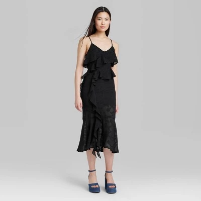 Solid-color woven midi dress from Wild Fable™ with a textured pattern and statement ruffles. Made of lightweight fabric with spandex for flexible comfort that moves with you. Designed with a sleeveless silhouette, V-neckline and a front slit. Side zipper and side hook-and-loop fastener complete the look and allow for easy dressing.
